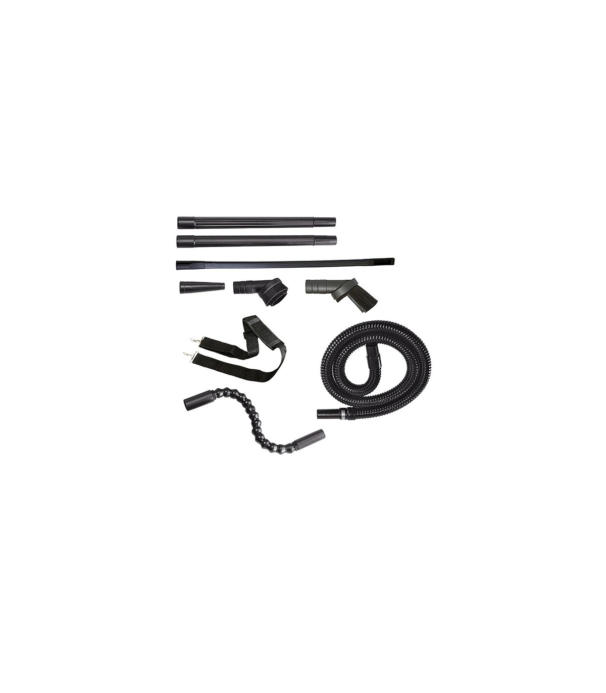 CVC-100 CoilVac filters, steel tank 182 cm vinyl crush-proof hose, two-piece 91.5 cm wand,48 cm flexible extension wand, 7.6 cm dual bristle dusting brush, 7.6 cm long bristle dusting brush, 12.7cm blower/bulk pickup nozzle, 71.1cm flexible crevice tool, 15.2cm flat brush and 122cm shoulder strap.